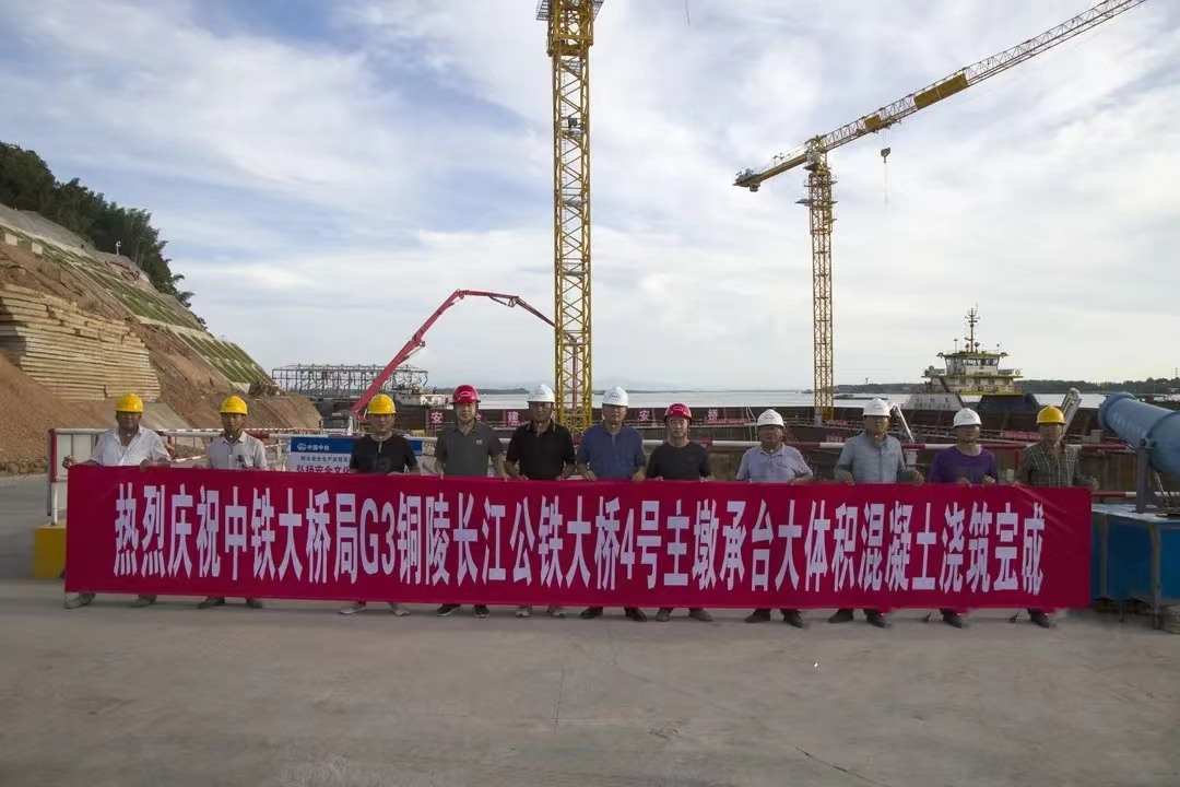 7月2日下午5時,G3銅陵長江公鐵大橋4號主墩承臺最后一次混凝土順利澆筑完成,至此,大橋南主塔承臺施工收官,正式轉(zhuǎn)入塔座施工階段。