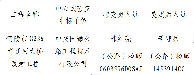 銅陵市G236青通河大橋改建工程中心試驗(yàn)室,于2019年9月29日開標(biāo),中標(biāo)單位為中交國通公路工程技術(shù)有限公司。因原中標(biāo)項(xiàng)目負(fù)責(zé)人個(gè)人家庭原因,無法到崗履行合同責(zé)任與義務(wù),故中交國通公路工程技術(shù)有限公司申請中心試驗(yàn)室項(xiàng)目負(fù)責(zé)人變更?,F(xiàn)將項(xiàng)目負(fù)責(zé)人變更情況予以公示,如有異議,請于7日內(nèi)向銅陵市綜合交通投資集團(tuán)有限公司反映。