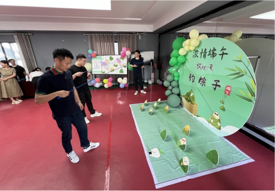 在游戲活動現(xiàn)場,充滿節(jié)日氣氛的裝飾映入眼簾,彩色的氣球、精美的展板,還有各式花樣的粽子、釣竿等道具,職工們紛紛揮動釣竿,試圖將掛有粽子的釣線準確地投入預(yù)設(shè)的“粽子池”中。一時間,現(xiàn)場歡聲笑語、熱鬧非凡。
